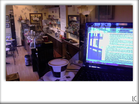 C’era un piccolo soppalco con pochi tavolini ed una sala interrata con una grande libreria ed io ebbi l’occasione di provare entrambe le postazioni. Nonostante il fascino evidente del seminterrato pieno di libri, il soppalco era in realtà l’angolo ideale dove poter scrivere, ben illuminato, tranquillo e con una vista diretta dall’alto al bancone della caffetteria.