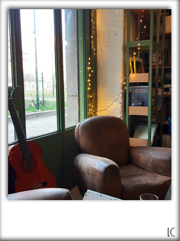 Il locale era piccolo, ma aveva già tutto quello che serviva per la mia ispirazione: libri – ovviamente – lucine sparse, piante appese e un angolino con poltrona e chitarra davanti alla vetrata. Il verde delle porte, della libreria e del bancone, poi, era forse uno dei colori più rilassanti che si possano trovare in giro, con un lieve rimando alla natura di Thoreau.