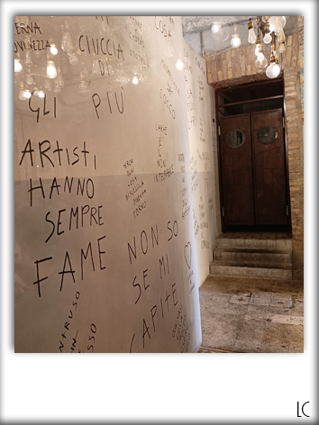 Nel corridoio che porta al bagno, troviamo delle scritte sul muro che ricordano quelle della scuola, tra cui la mia preferita: “Gli artisti hanno sempre fame“.