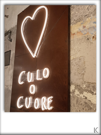 Hanno da poco aperto una nuova saletta interna che ha degli elementi davvero straordinari: scegliete voi se restare più entusiasti dal testo di Imagine scritto sulle piastrelle oppure dal cuore a neon con la scritta “Culo o cuore“.